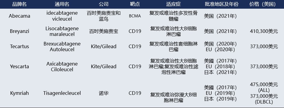 CAR-T(Chimeric Antigen Receptor T-Cell)療法作為免疫治療中具有治愈癌癥前景的重要療法自始至終都是近代醫學界的關注焦點。作為過繼細胞免疫療法之一,CAR-T療法的進展顯著優于TILs、 TCRs,主要用于治療血液腫瘤,不過對于實體瘤的治療仍有待突破。目前全球共有5款CAR-T細胞治療產品上市,2017年8月31日,美國FDA批準諾華的CAR-T療法Kymriah(CTL019)上市,作為全球首個獲批的CAR-T治療產品,正式宣告了CAR-T技術實現了產業化。表一. 全球已有5款CAR-T細胞療法產品在美國獲FDA批準上市