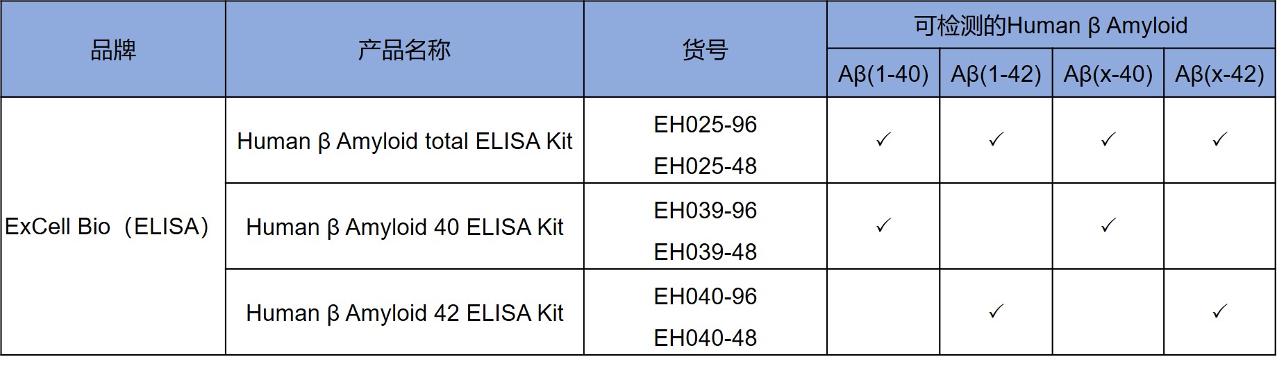 · 種類齊全:可檢測不同長度的Aβ · 樣本類型:血清、血漿、細胞培養上清、腦脊液等 · 高特異性、低CV值(<8%) · 高靈敏度:7pg/ml |