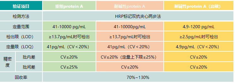 在抗體類產品的生產純化過程中,Protein A 親和層析樹脂是分離和純化抗體常用的工具。但在抗體純化過程中Protein A 會脫落致使抗體類產品中含有Protein A,從而影響產品的純度和效價,給制藥業帶來重大問題,例如《中國藥典》2020 年版規定尼妥珠單抗注射液用酶聯免疫法檢測出的 Protein A 的殘留 量應不高于蛋白總量的0.001%,故必須對生物制品中的 Protein A殘留進行檢測。Protein A包括天然 Protein A、重組 Protein A 以及結構與天然 Protein A 有顯著區別的耐堿性重組 Protein A,如GE公司的 MabSelect SuReTM Protein A。依科賽的 CRP00-303*系列試劑盒可對耐堿性重組 Protein A進行定量檢測。如果您需要更寬的工作范圍,請選擇我們的 CRP00-302*系列試劑盒。如果您需要檢測脫落的天然 Protein A、重組 Protein A ,請選擇我們的 CRP00-301*系列試劑盒。